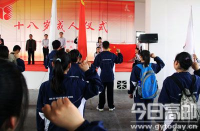 “我是中华人民共和国公民,在十八岁成人之际,面对国旗,庄严宣誓:我立志成为有理想、有道德、有文化、有纪律的社会主义公民……”3日下午,公园礼堂内,来自高邮中学、第一中学、第二中学、高邮中专的200名学生代表,面对鲜艳的五星红旗,通过庄严而隆重的“成人仪式”向大家宣布:今天,我长大了!副市长钱富强参加活动。