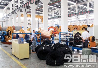 扬州曙光电缆有限公司为做好500KV超高压电缆的配套产品,于去年5月又投入5000万元新建标高22米辐照交联电缆项目生产线2条。目前该项目已投入生产,预计可新增产值5亿元。图为工人们在流水线上操作的场景。