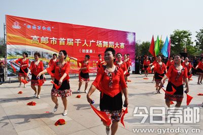 昨日下午,“高邮市首届千人广场舞蹈大赛”初赛在蝶园市民广场展开,40多支代表队千余名舞蹈爱好者将分三批集中展示《高邮西北乡》、《杨柳青》等百姓喜闻乐见的舞蹈健身操,喜迎第九届中国双黄鸭蛋节的到来。图为比赛现场。