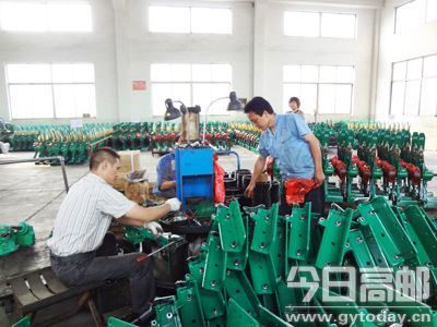 高邮市平安开沟机制造有限公司生产的“民安”牌开沟机,拥有10余项发明专利,被列为国家及江苏、安徽、湖北等省农机购置补贴产品。今年以来,该公司已销售开沟机近5000台,销量占全国同类产品70%以上。图为生产车间一角。