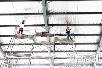 总投资10亿元的高邮康新物流发展有限公司一期工程8幢48000平米厂房已建成,目前正在进行室内设施安装,预计7月份部分厂房可交付使用。据了解,全部工程完工后,该公司将形成羽绒服原辅材料7000吨、羽绒服成品4000万件的年物流量。图为施工人员正在安装室内设施。