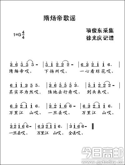 歌谣传唱人项俊东是我市知名文史爱好者,多年一直搜集民间歌谣、高邮地方史料。他告诉记者,这首歌谣是他在原市高华公司负责煤炭调运工作时采集到的,因为和隋炀帝有关,他暂且称其为《隋炀帝歌谣》。他说,2004年夏季,他随行的运煤船队在扬州南郊施桥船闸被堵6天。一天,他在船舱里午休,忽然听到有人哼唱小曲,引起了他的注意。他走到船舱外,看到旁边运粮船上一白须老人一边理着船缆,一边哼着这首歌谣。他走到老人身边,向他请教。老人说,这首歌谣是唱隋炀帝的,祖上传下来的,现在没人会唱了。他请求老人重复哼唱,而他则边听边记,边问边学,完整地学会了这首歌谣。直到最近,新发现的隋炀帝墓引发媒体和社会的广泛关注,他才想起多年前采集到的这首歌谣。