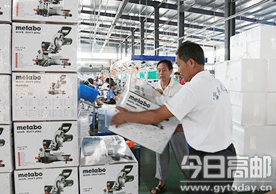 今年上半年,江苏金飞达电动工具有限公司顺利实现双过半,目前企业新厂区正进一步完善,四条生产流水线投入运转,预计今年该公司电动工具出口量将达500万台以上。图为新厂区员工正在搬运发往欧洲的产品。