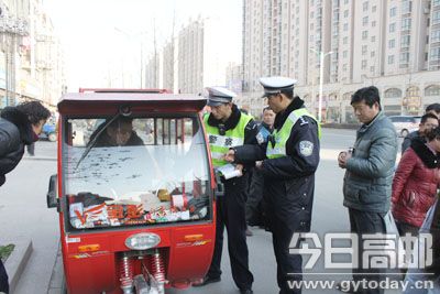 为确保春运安全、有序、畅通,近日,我市警方加大对封闭式三、四轮电动车违规上路的查处力度,截至目前,已扣留无牌无证封闭式三、四轮电动车22辆。图为10日下午交巡警在通湖东路上执法的场景。