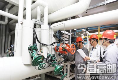 江苏国信高邮燃气热电联产项目1号机组投入运营后,各项性能指标优良,并开始向开发区19家重点企业集中供热。图为工作人员对汽轮机进行检测的场景。