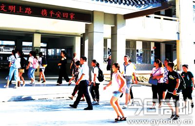 昨日,全市高中、初中、小学的学生结束了暑假生活,陆续到学校报到。图为市城北实验小学学生在家人陪同下到校报到的场景。 王林山 摄