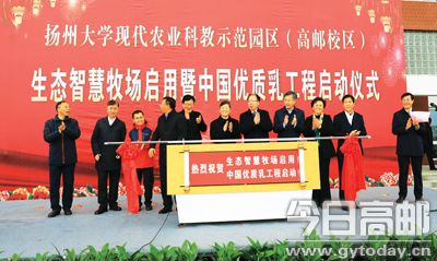 总投资1.8亿元的扬州大学现代农业科教示范区(高邮校区)生态智慧牧场于2017年1月16日开工建设,按照“规模化、标准化、生态型、智慧型”的标准建设,是一所集实验教学、科学研究、奶源生产、成果孵化、品种展示、国际交流与合作、技术示范和推广于一体的综合性现代化牧场。项目总设计饲养规模为3000头奶牛,其中一期饲养规模为2000头,建有大小牛舍和挤奶大厅、精粗饲料车间、卫生消毒防疫、粪污处理及办公生活等各类生产生活设施,并拥有先进的转盘式挤奶系统,每年可提供安全放心优质生鲜乳1000万公斤,将为扬州市“115鲜奶工程”提供更加优质、放心的奶源。