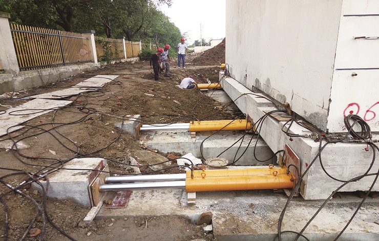 现场施工单位负责人告诉记者,实施平移的建筑物主体4层,局部5层,为框架结构,自重大约有4000余吨。根据设计安排,平移工程先将建筑物整体向西水平直线平移约29米,再向南平移约120米。