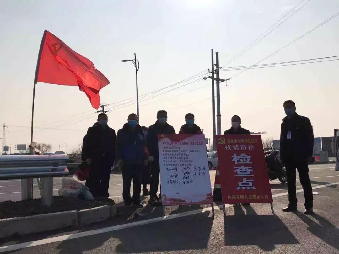 汤庄镇党委为充分发挥党组织的战斗堡垒作用,建立了“五级党组织”联防联控的工作机制,镇党委统筹调度、靠前指挥;成立中共汤庄镇新型冠状病毒感染的肺炎疫情防控指挥部临时支部委员会,领导“一室五组”开展疫情防控工作;17个疫情防控一线临时党支部,于各个主要入口设立检查点,检测并登记入境人员;各村组建了“三人小组”党员先锋队,每天两次登门检测有疫情重点地区接触史的人员体温;党员志愿者自发组建了志愿宣传队,挨家挨户进行入户宣传防疫知识。
