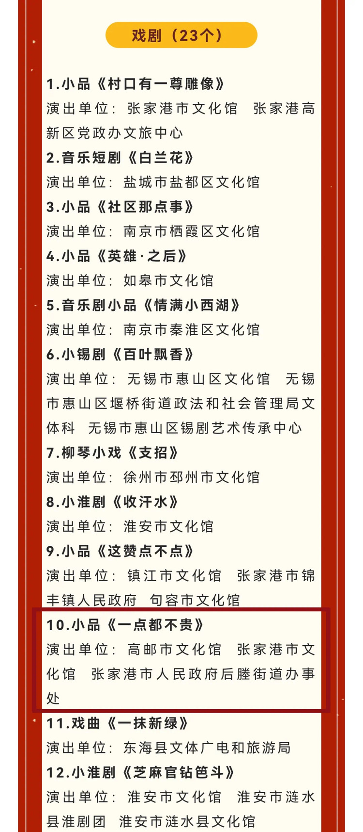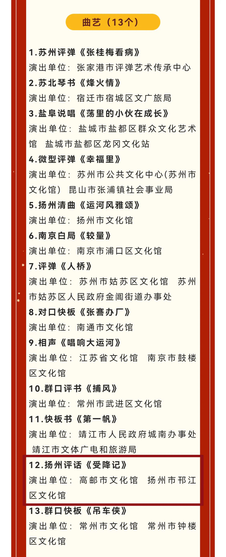 “五星工程奖”是江苏省群众文化艺术政府最高奖。近日,第十五届江苏省“五星工程奖”评奖结果公布,由市文化馆创作的小品《一点都不贵》和扬州评话《受降记》双双获奖,女声独唱《运河柳》入围决赛。据了解,此次是我市文艺作品自2008年后再摘“星”,获奖数量位列扬州首位,实现了在扬州县市区中唯一获奖、双双获奖的荣誉,这也是我市迄今参评江苏省“五星工程奖”取得的最佳成绩。