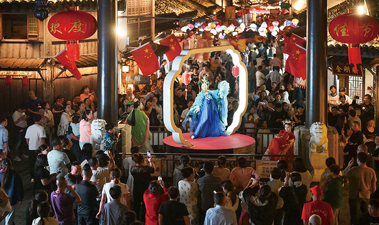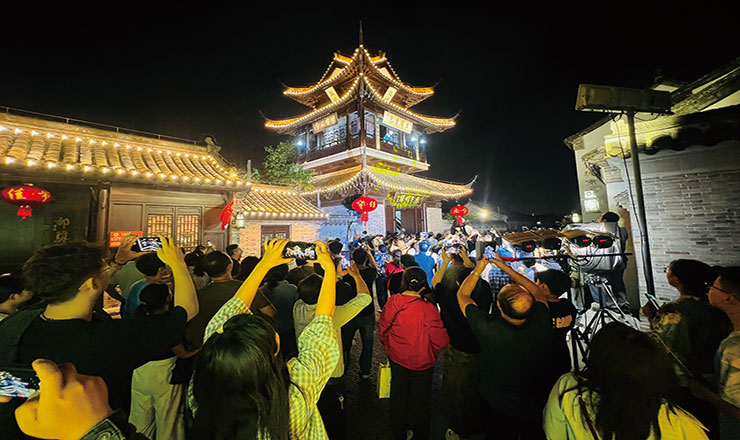 文旅业态的创新升级是推动游客增长的重要动力。南门大街推出的“明潮游园会”,通过国风雅集表演、《天宫赐福》等夜间光影演艺及NPC互动巡游,塑造了沉浸式游览体验,带动夜间游览人次同比增长16.6%,周边餐饮、零售消费额增长123%。西堤营地“湖上升明月”沉浸式夜游、无人机灯光秀首演等项目,构建了集观光、休闲于一体的湖滨夜间消费场景,为游客和市民提供了高邮湖畔夜游项目新体验。文游台景区通过演绎《苏小妹三难秦少游》等沉浸式剧目,实现接待游客人数与营收成倍增长;汪曾祺纪念馆开设《沙家浜》小剧场,让游客在游览的同时,深度体验汪老经典剧目的现实场景;市文化馆在幸福里、吾悦广场2个商圈陆续举办多场国庆文艺惠民展演和群众歌咏比赛,实现了客流与营收的双重提升。