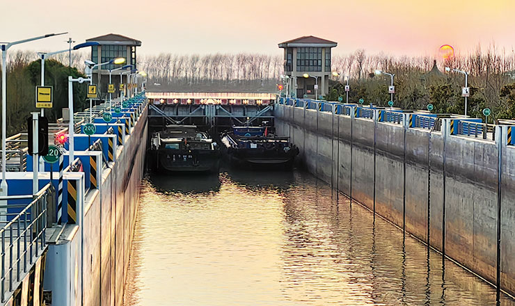 截至12月24日,运东船闸今年以来已累计安全开放5988个闸次,放行各类船舶22264艘,货物通过量1020.1万吨 ,为里下河地区生产生活物资供应提供了重要的服务保障。图为运东船闸运行现场。