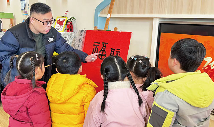 近日,市直机关幼儿园特别邀请扬州市青年书法家协会副主席吴顺乐,为孩子们带来了一堂别开生面的文化启蒙课。在吴老师手把手的悉心指导下,孩子们认真临摹,一个个饱含童趣的“福”字跃然纸上。墨香氤氲间,欢声笑语中,孩子们不仅体验了书法艺术的魅力,更在传统文化的浸润中提前感受到新年的喜庆氛围。图为活动现场。