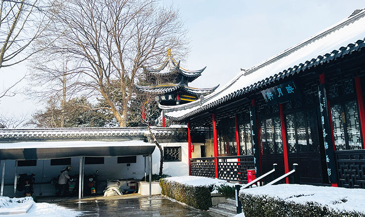 红墙黛瓦覆新雪,古枝静待春风归。19日晚,一场瑞雪翩然而至,高邮大地银装素裹、美不胜收。图为人民公园一景。