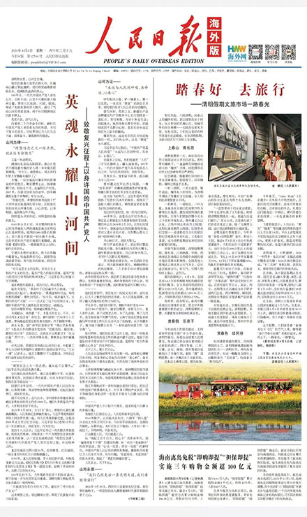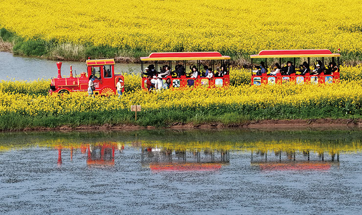 6日,湖上花海景区美景登上《人民日报海外版》头版。图片中,复古红色观光小火车穿梭于金黄花浪之间,湖风轻拂,菜花金黄,游客们凭栏远眺,尽情欣赏高邮春日绝美景致。 孟德龙/图 邮萱 孔令玲/文