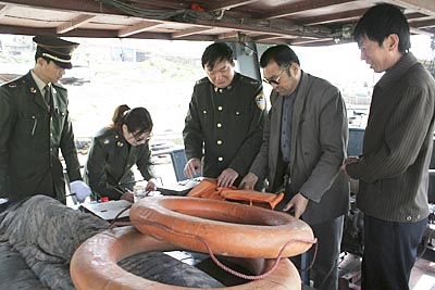 为确保“五一”期间辖区道路、水上交通安全,高邮镇交通管理所近日对辖区内的道路、渡口进行了一次安全检查。图为执法人员正在渡口检查。