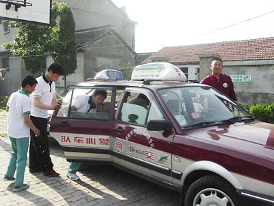 在荷花塘特殊教育学校,市防控处警队为学生们送上了学习用品,爱心车队的队员们将特殊教育学校的孩子们带至文游台、海潮市民广场等处,让他们感受邮城的巨大变化。 图为学生们准备出发 。