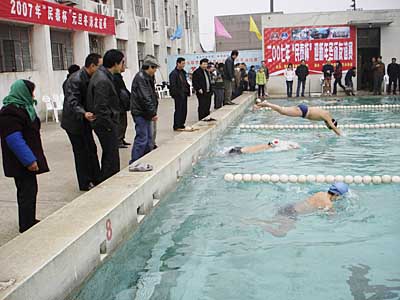 1日,市体育局、市冬泳协会、扬州民泰律师事务所联合举办了“元旦冬泳友谊赛”,副市长钱富强参加了开赛仪式。他对冬泳队伍不断壮大、影响不断提升给予了充分肯定,同时希望能有更多的人加入到冬泳队伍中来。图为比赛现场。