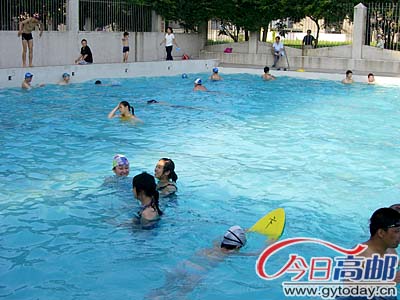9日早晨6点,在体育场游泳池里,一群小朋友正在水里打球嬉戏。连日来,由于持续高温天气,许多家长纷纷带着孩子来到游泳池游泳避暑。
