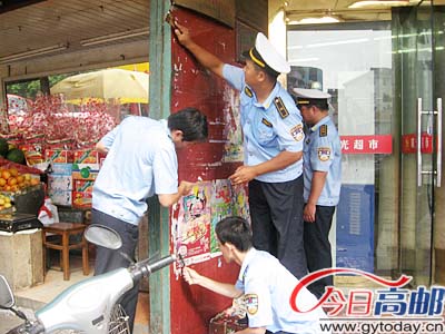 为迎接“双节”举办,日前,市容管理执法大队对城区主干道两侧“野广告”再一次进行了全面清理。图为执法队员清除野广告。