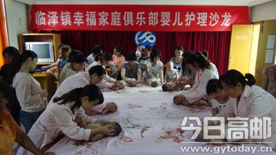 日前,临泽镇计生办举办幸福家庭俱乐部婴儿护理沙龙活动,全镇16个2-8月龄的婴幼儿家庭参加活动。图为具有国家中级育婴师职称的8名育婴师正在为家长示范婴儿身体抚触手法,让孩子父母了解婴儿抚触的好处。