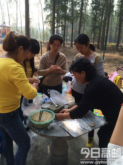 26日,市南海艺术幼儿园组织亲子一日游活动,中班的近百名家长陪同子女赴渌洋湖湿地公园野炊。图为中(2)班家长在包饺子。