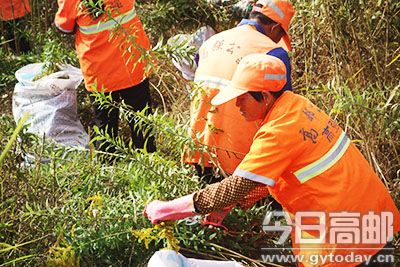 进入秋季以来,我市境内多处发现“一枝黄花”,233省道和203县道路边尤为严重。对此,市公路部门高度重视,从10月28日起专门组织人员清剿。图为市公路管理站养护工人在233省道安大公路旁集中铲除“一枝黄花”。