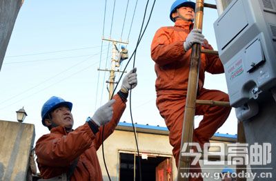 日前,我市最低气温已降至零下3℃。为保障居民在寒潮之际用电负荷增大情况下的可靠供电,市供电公司积极组织人员对一些用电负荷较大的配电台区的低压接户线进行整改。图为2日,临泽供电所员工正在临泽镇西河村1号配电台区配合外协单位整改接户线。