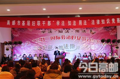 2015年初,市妇联在全市基层妇联干部中开展维护妇女儿童合法权益相关法律知识以及文明礼仪知识竞赛活动。经过前期各乡镇的宣传学习和初赛选拔,3月2日至3日,纪念“三八”国际劳动妇女节105周年暨基层妇联干部法律知识竞赛两场预赛分别在三垛镇、城南经济新区举行。最终,临泽、界首、汤庄、城南新区、高邮镇、卸甲六支代表队进入3月6日的决赛。图为知识竞赛现场。