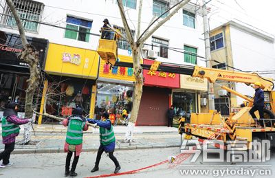春季到来,树木由休眠期转入生长期。连日来,市园林绿化部门联合供电部门,对城区珠湖路、文游路等主干道的树木进行集中修剪,以达到防治病虫害,保证车辆安全出行的目的。图为工人们正在文化宫路上修剪梧桐树的场景。
