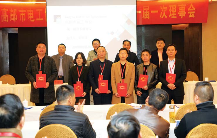 24日,高邮市电工协会成立。据了解,目前我市从事电工人员近1300人,协会的成立对于团结凝聚全市广大电器工作者、培养举荐优秀电器人才、推动高邮市电气事业的发展等具有十分重要的意义。图为相关部门向当选协会理事会成员颁发聘书。 王林山 摄