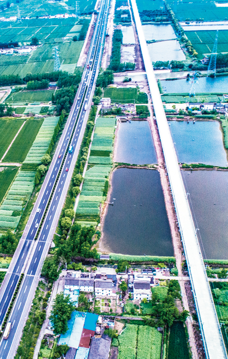 连淮扬镇铁路宝应段施工现场已经铺上了一层厚厚的石子。连日来,施工队分两班全天候24小时推进铺轨,每天能够保证2公里的铺轨进度。预计5月下旬钢轨就能铺设到我市境内。图为龙虬段的高铁桥梁。 王林山 摄