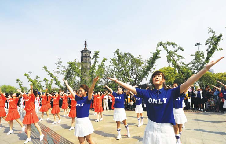 11日,由市委、市政府和市新时代文明实践中心主办,市委宣传部、市文明办、市妇联、市文广旅局和市文化馆共同承办的2019年“文明实践 你我同行”高邮市民日活动暨“好事成双在高邮”广场舞大赛(初赛)在净土寺塔广场举行,来自市级机关部门单位、各乡镇园区的35支参赛队伍,以热情、动感的舞蹈展现出高邮市民的精神风貌。活动期间还举行了高邮市新时代文明实践巾帼志愿服务队授旗仪式,分别授予15个乡镇、园区及部门单位“巾帼宣传教育志愿者服务队”“巾帼法律维权志愿者服务队”“巾帼文明养成志愿者服务队”“巾帼爱心帮扶志愿者服务队”和“巾帼乡村振兴志愿者服务队”旗帜。图为比赛现场。葛维祥 王林山 摄影报道