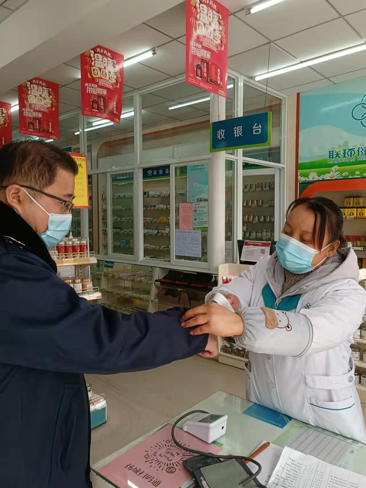三是强化再督促检查,筑牢安全“生命线”。1月4日以来,分局对辖区内的33家零售药店全覆盖,开展了多次常态化疫情防控督促检查,主要检查药店销售“四类药品”是否实名信息登记报告、是否严格执行进入人员佩戴口罩、是否测温及设置一米线警示标识、是否张贴“扬城扫码通”并确保进入人员扫码留痕、对潜在风险购买人员是否清楚处置流程、是否按规定核酸检测并接种新冠病毒疫苗。通过以上几方面重点检查要求,确保零售药店有按照要求严格执行疫情防控措施、认真落实疫情防控要求,织密织牢零售药店疫情“防控网”,从源头上筑牢人民群众安全“生命线”。