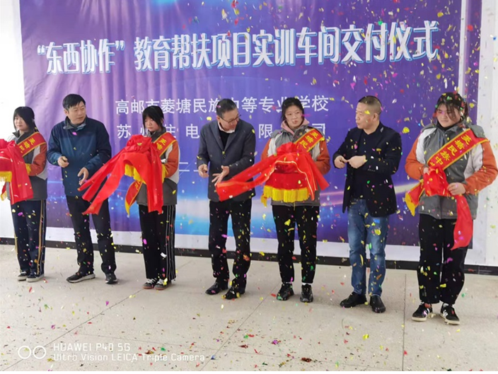 调研过程中,校方向他们详细介绍了学校办学历史、专业设置及校企合作情况。随后,在高邮中专菱塘分校举行了“东西协作”教育帮扶实训车间交付仪式,双方为交付仪式剪彩。