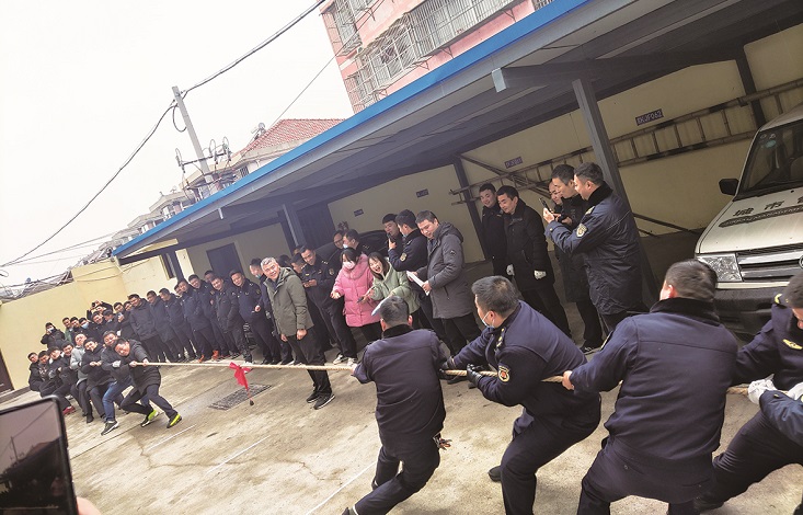 近日,城管系统举行“迎新年 促团结 聚合力”主题职工趣味大赛,丰富职工业余文化生活,喜迎新年的到来。大赛内容包括竞走、跳绳、拔河等,吸引了100多名职工参加。图为拔河现场。