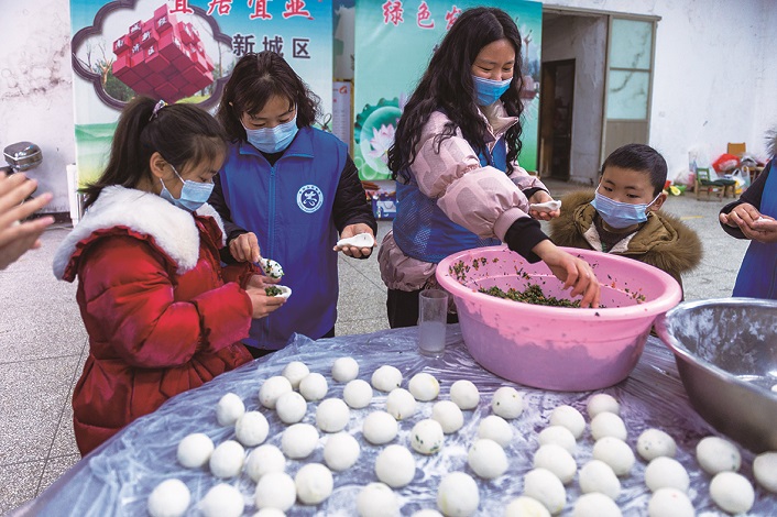 正月十三上灯日吃元宵是高邮地区的风俗习惯,13日上午,城南新区新时代文明实践所联合区妇联开展“包元宵 送元宵”活动,为辖区内的五保户、留守独居老人、失独家庭、残困户等送上关怀和温暖。图为志愿者们正在包元宵。 郑红梅 王红 摄影报道
